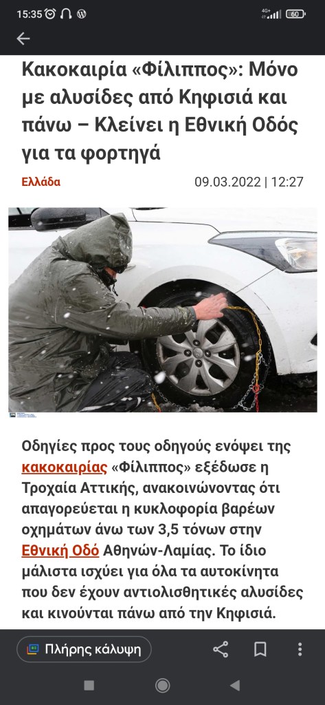 NewsIT: Κακοκαιρία «Φίλιππος»: Μόνο με αλυσίδες από Κηφισιά και πάνω – Κλείνει η Εθνική Οδός για τα φορτηγά. https://www.newsit.gr/ellada/kakokairia-filippos-mono-me-alysides-apo-kifisia-kai-pano-kleinei-i-ethniki-odos-gia-ta-fortiga/3483458/