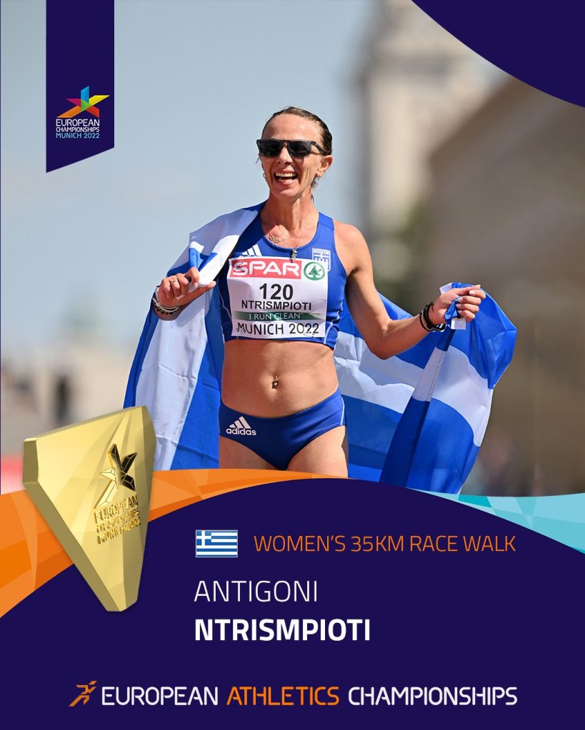 🥇 Τρομερή Αντιγόνη Ντρισμπιώτη, κατέκτησε το χρυσό μετάλλιο στα 35χλμ. βάδην στο Ευρωπαϊκό Πρωτάθλημα στίβου στο Μόναχο, τερματίζοντας με την ελληνική σημαία 🇬🇷#TeamHellas#Athletics#Munich2022@ECMunich2022 @PRESEGAS pic.twitter.com/Hid2eCLJqL